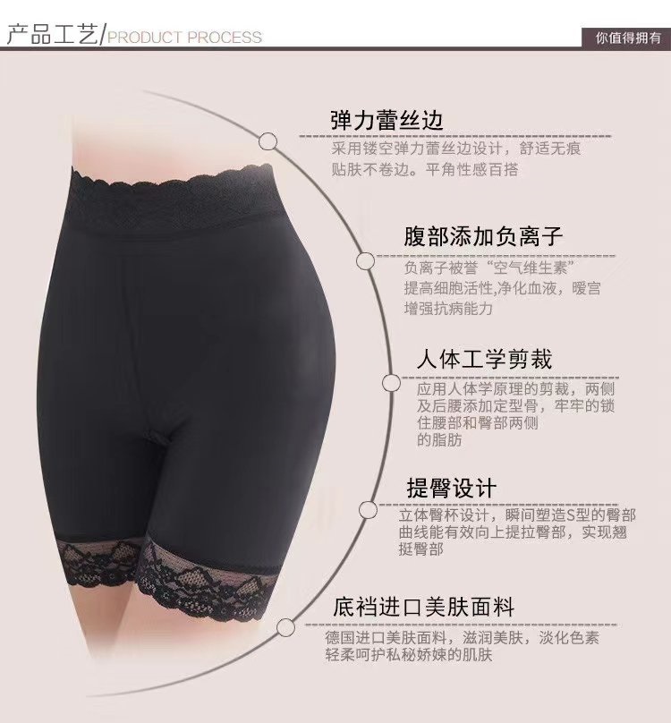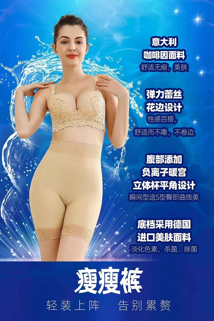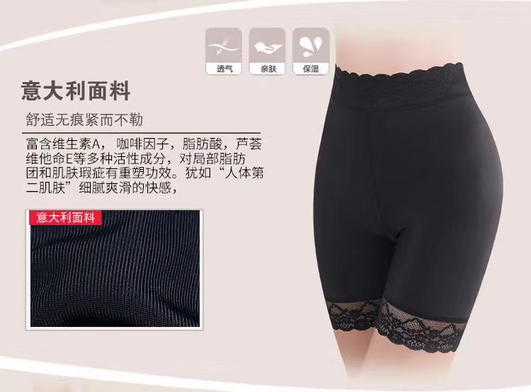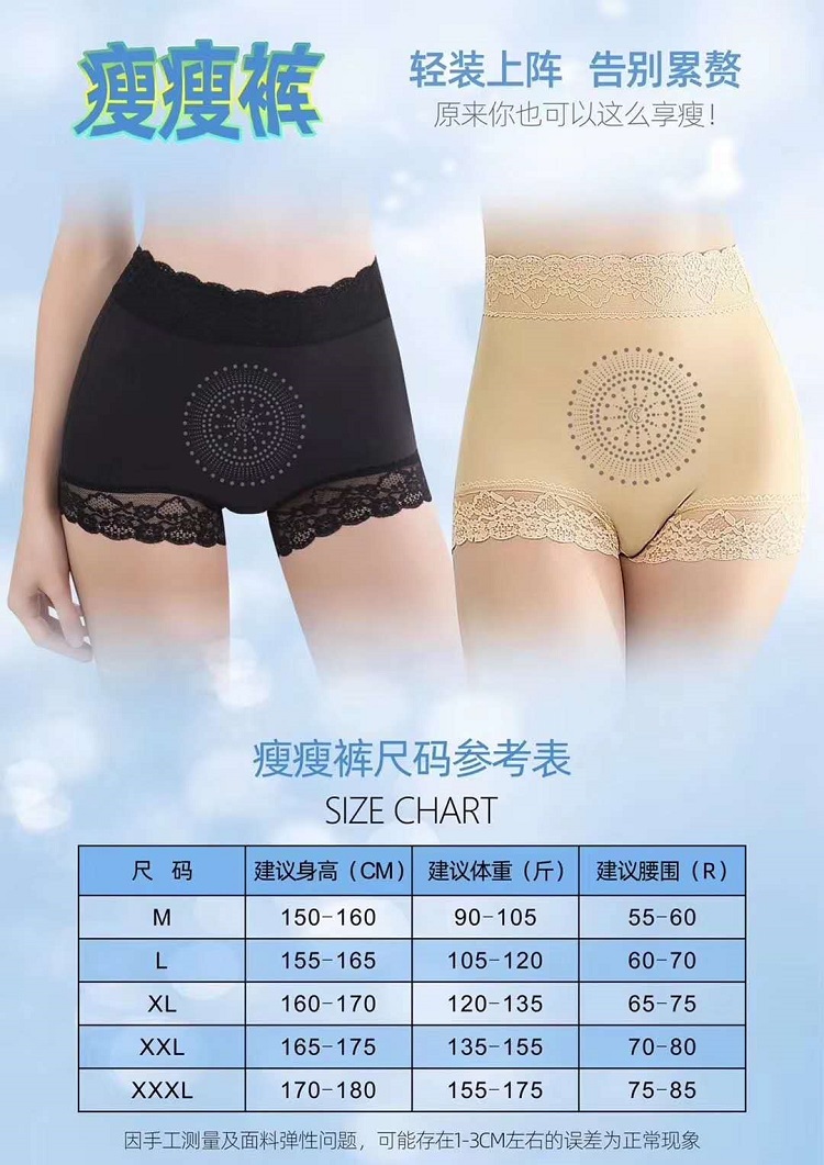 瘦瘦裤 轻装上阵,告别累赘颜色:黑色、肤色 尺码:M 、L、XL、XXL、XXXL 一条=收腹裤+内裤+安全裤     产品介绍: 1.意大利咖啡因面料,舒适无痕,美肤. 2.弹力蕾丝花边设计,性感百搭,舒适而不嘞,不卷边 3.腹部添加负离子暖宫,立体杯平角设计,瞬间型造S型臀部曲线美 4.底档 采用德国进口美肤面料,淡化色素,杀菌、除菌