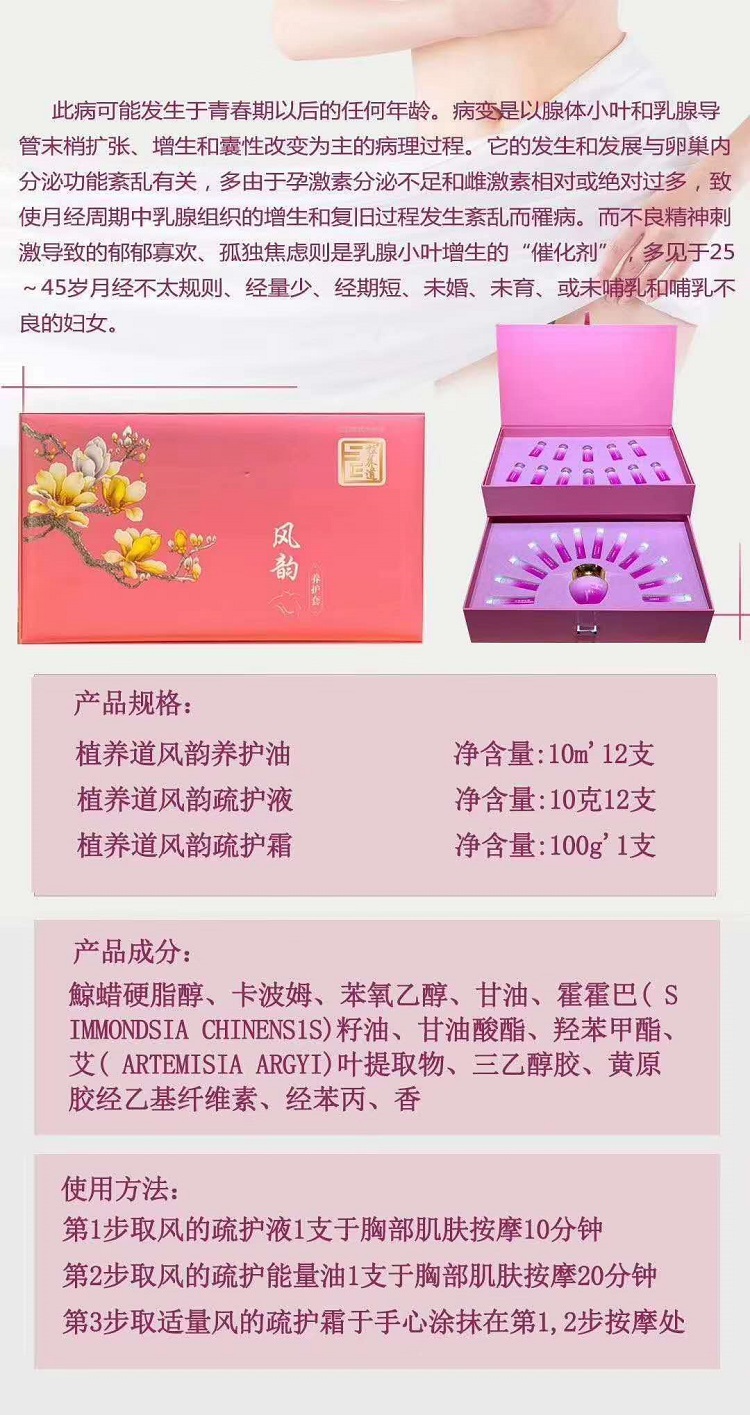 女性形体管理-风韵养护套套 韩式通乳/ 中式回乳 /乳腺疏通/ 巩固坚挺 1、舒胸,散结,滋养 2、丰胸,令胸部丰满 3、健胸,令胸部健康无气节 4、美胸,令胸部不下垂坚挺 5、护胸,令胸部天天都在做保养,保护胸部的健康! 6、养胸,长期使用可让胸部永远保持弹性!