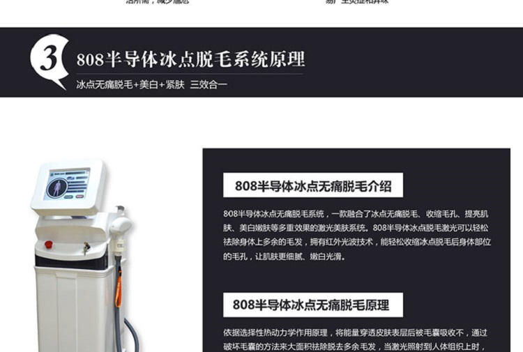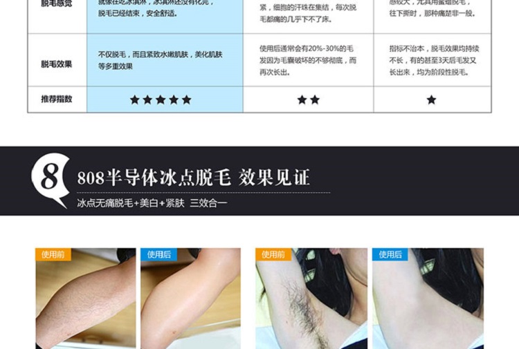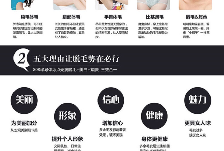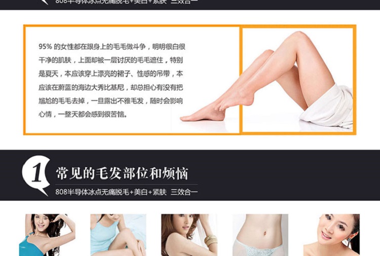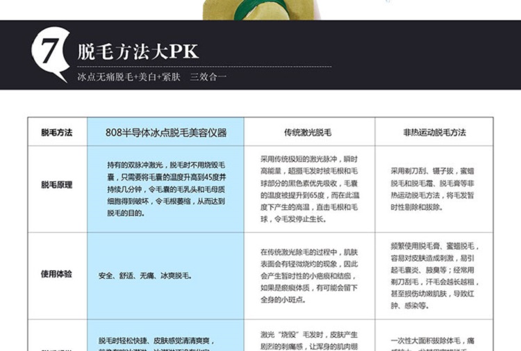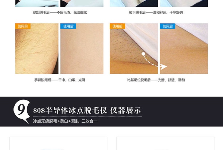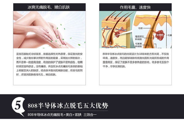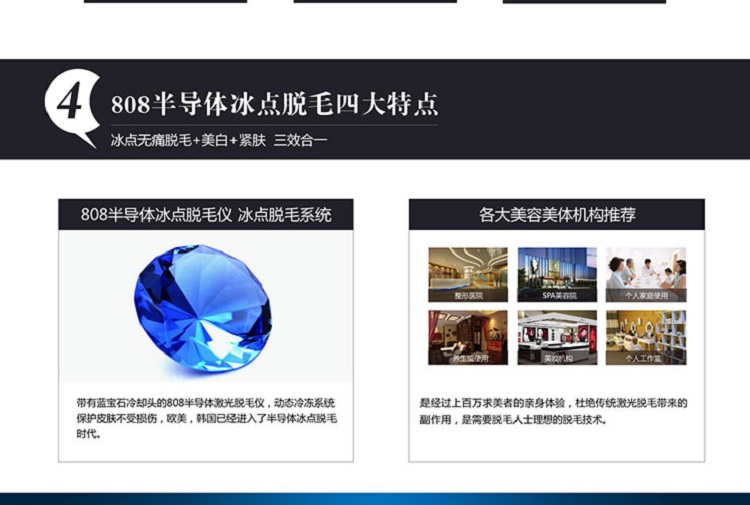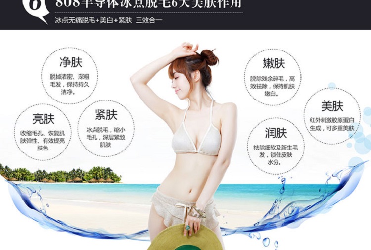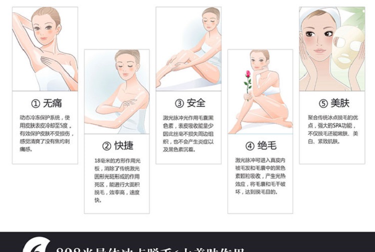功效:冰点脱毛、美白嫩肤、紧致肌肤、收缩毛孔、提亮肌肤、美白嫩肤。 6大美肤:净肤、亮肤、紧肤、嫩肤、美肤、润肤