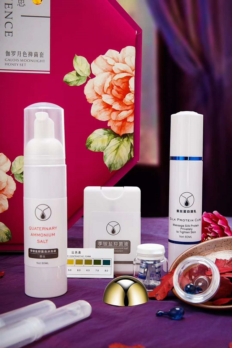 1、PH测试纸*2 2、季铵盐杀菌喷液20ML*2瓶 3、季铵盐泡沫洗液80ML*1瓶 4、蚕丝蛋白按摩凝乳80ML*1瓶 5、净化精华5瓶*2粒=10粒6、季铵盐抑菌凝胶3.3g*10支 核心成份:加勒比葡萄柚、季铵盐、薄荷脑、烷基糖苷功效:抑制白色念珠菌、金黄色葡萄球菌等明显,祛异味